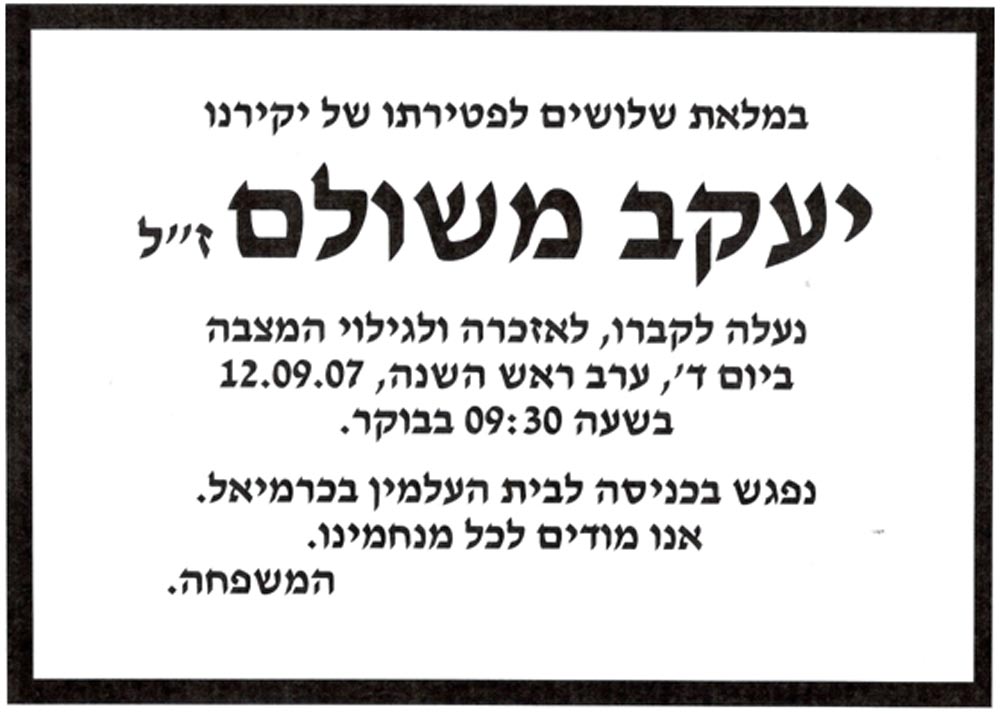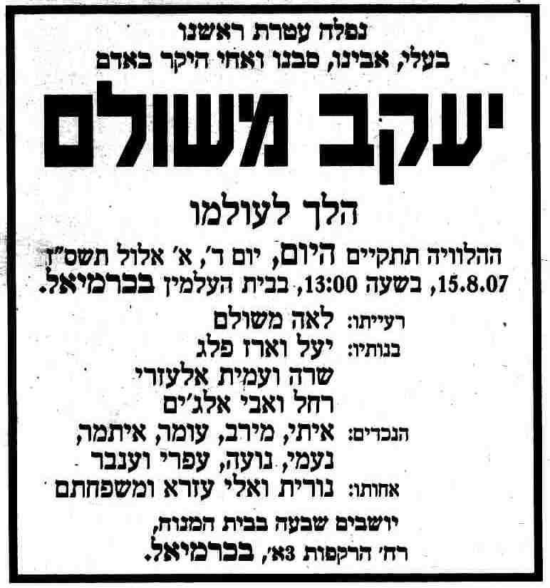 של יעקב משולם ז"ל אשר יתקיים ערה"ש 12.9.07 בשעה 09:30